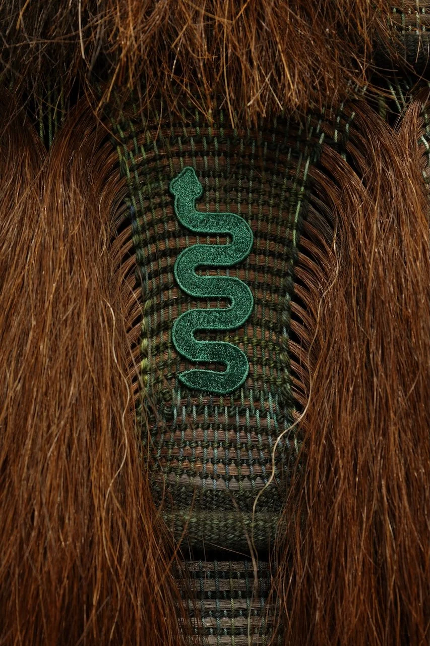 Horsehair and hand-dyed cotton, wool, rayon thread, metal, and pigment